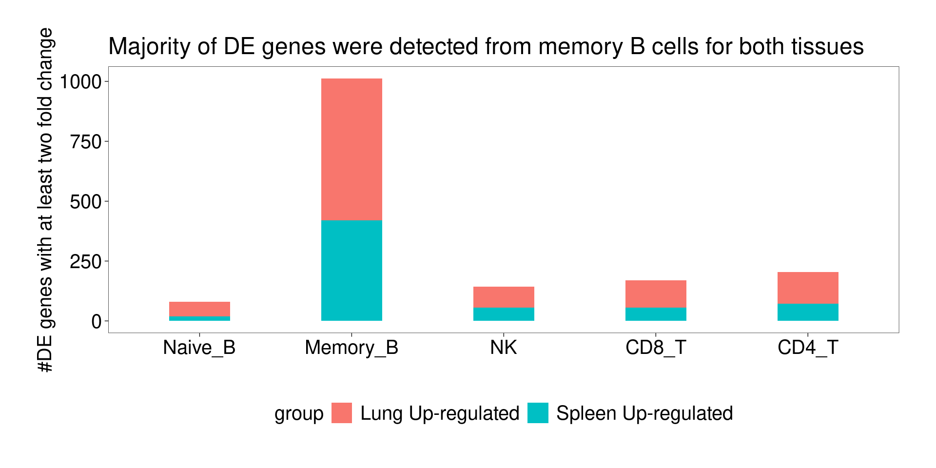 A barplot for number of DE genes detected for each cell type except for Th17 and Treg, due to low number of cells in spleen.